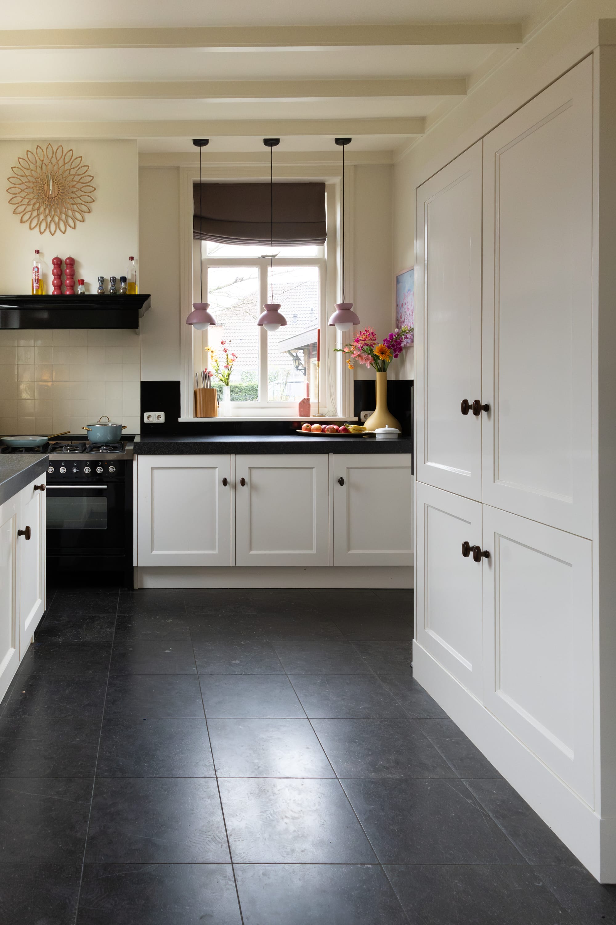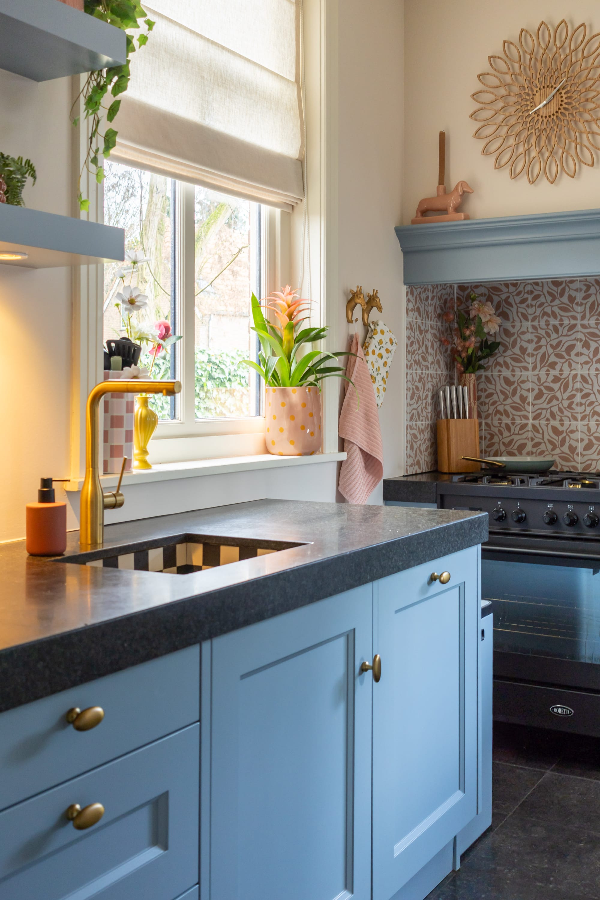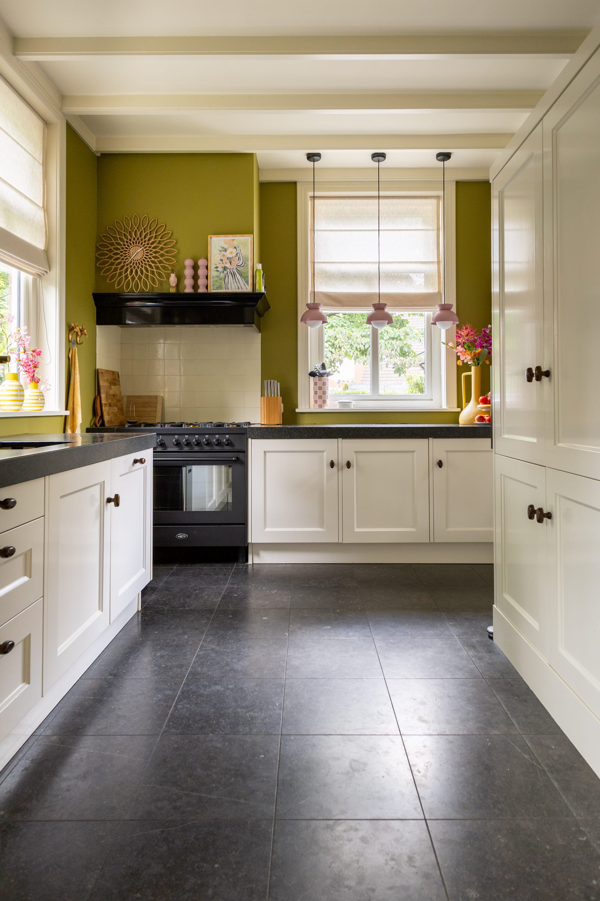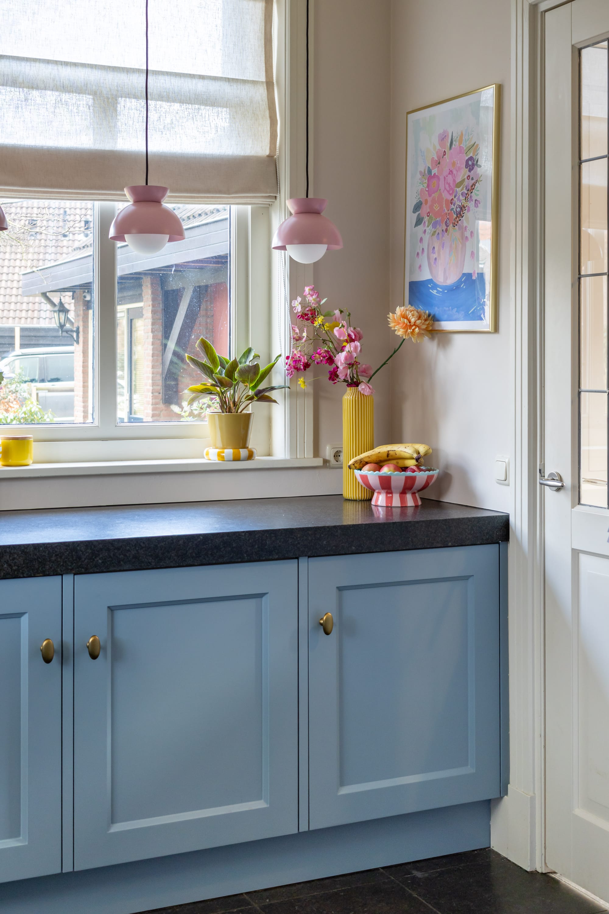 En wit, dat wilde ik dus niet meer. Natuurlijk begon ik met wat snelle, simpele aanpassingen. Gekleurde hanglampen erboven, een grote vaas op het aanrecht. Kleine ingrepen die meteen wat leven brachten. Maar ik wist: dit is nog niet genoeg.