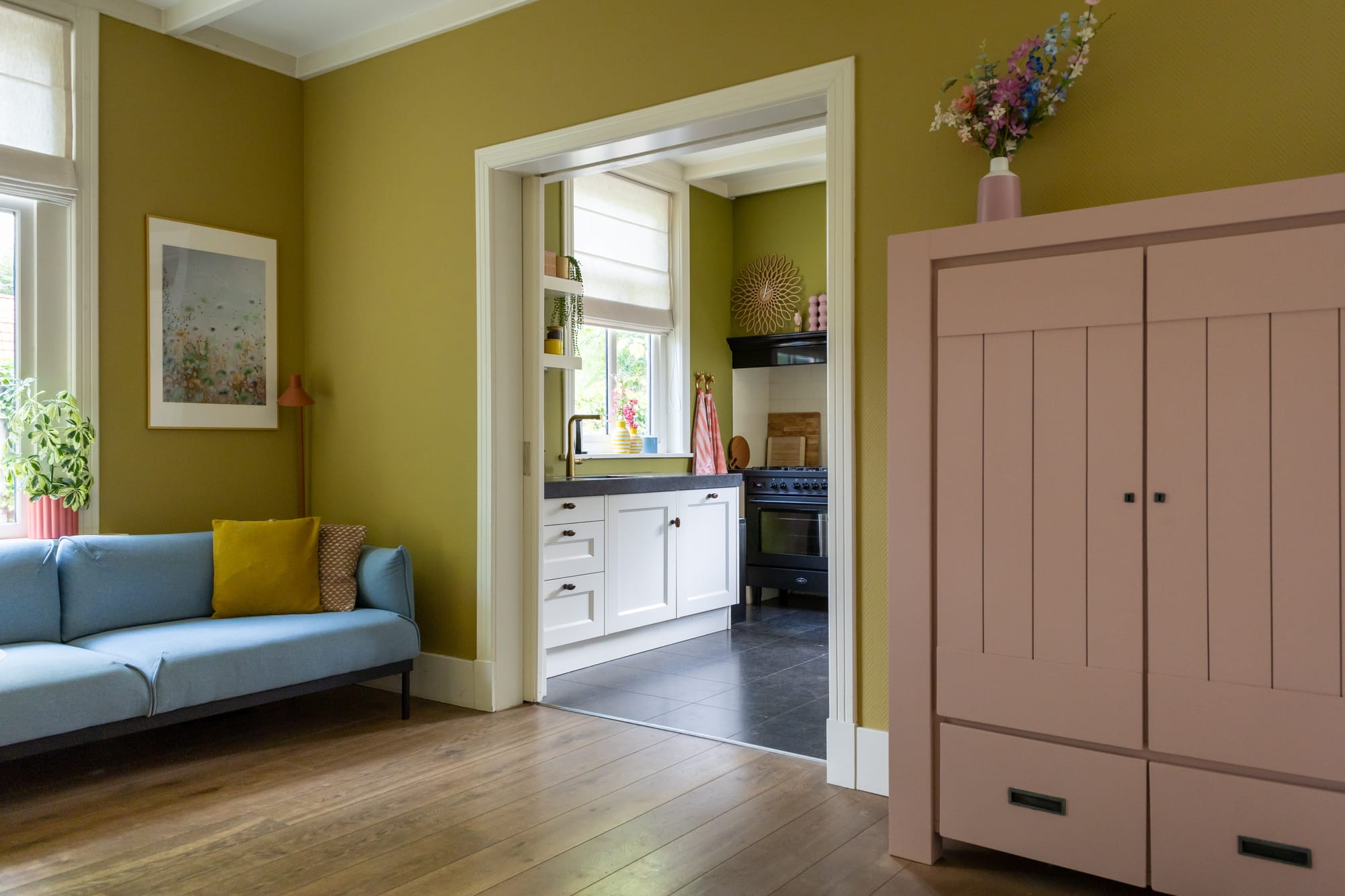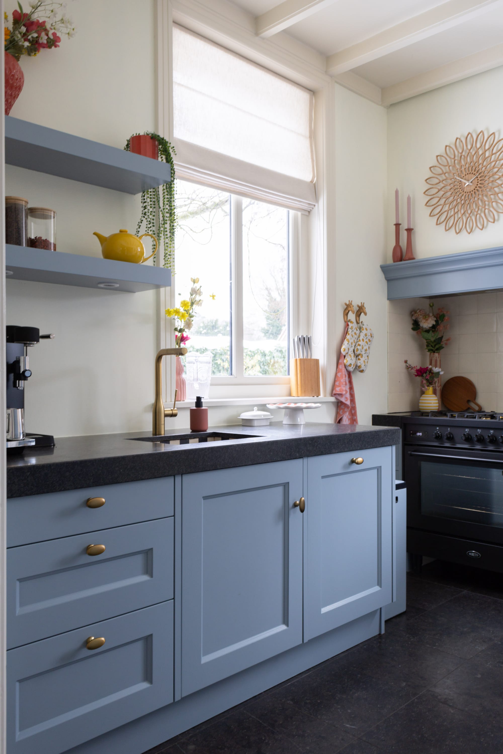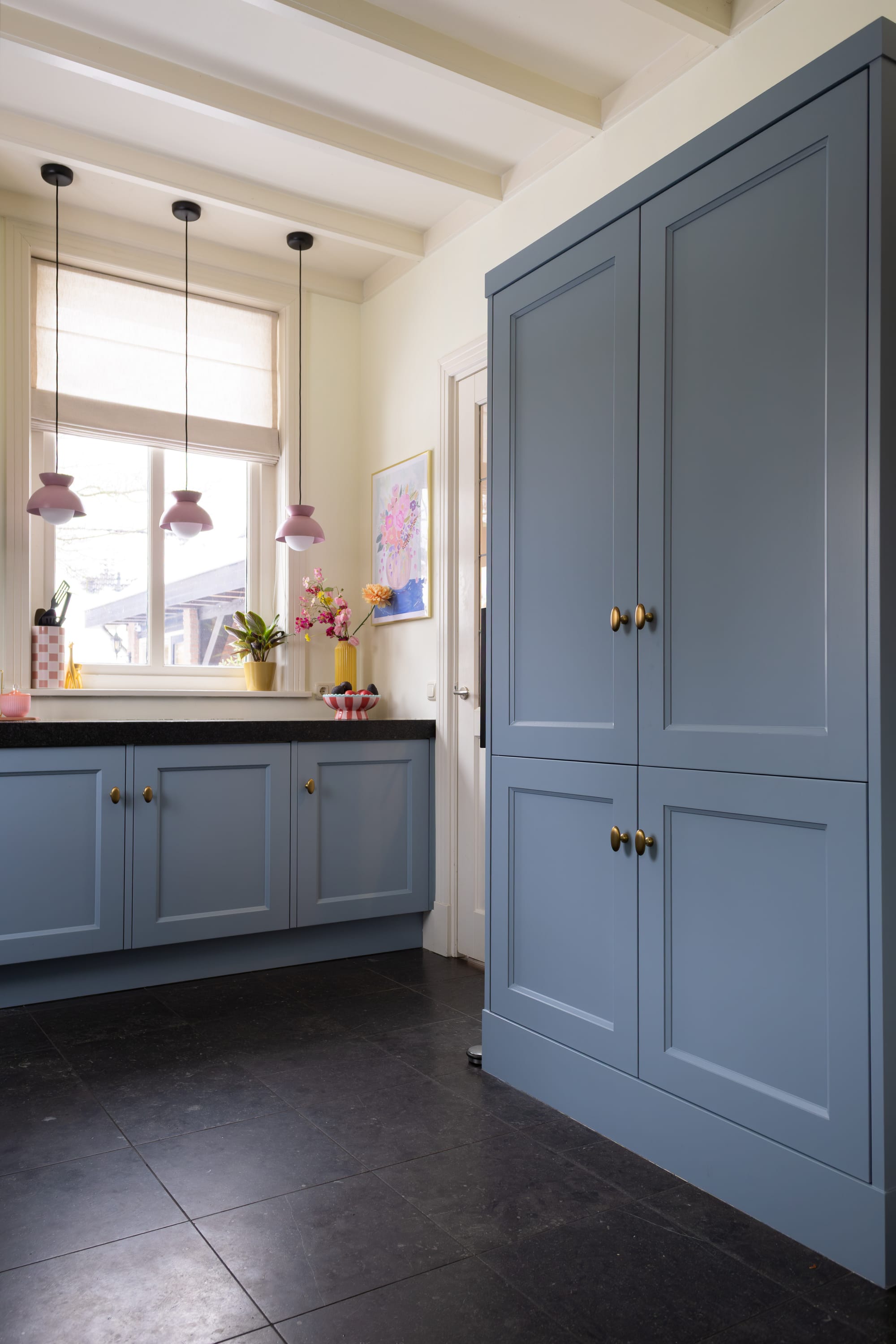 Geen 50 tinten grijs maar wel 50 tinten blauw, geel en roze. En ik wist dat mijn man écht geen roze keuken wilde maar mijn moodboard op Pinterest was wel compleet terra-roze uitgeslagen. Ik neigde naar geel maar die kleur wordt zo extreem beïnvloed door onze tuin op het zuiden dat het het ene moment een fijne warme tint kan zijn en het volgende moment opeens heel heftig wordt of juist heel flets. Ik nam de terugweg naar blauw en koos een kleur die ik in Haarlem ook veelvuldig gebruikt had: Suave Indigo.