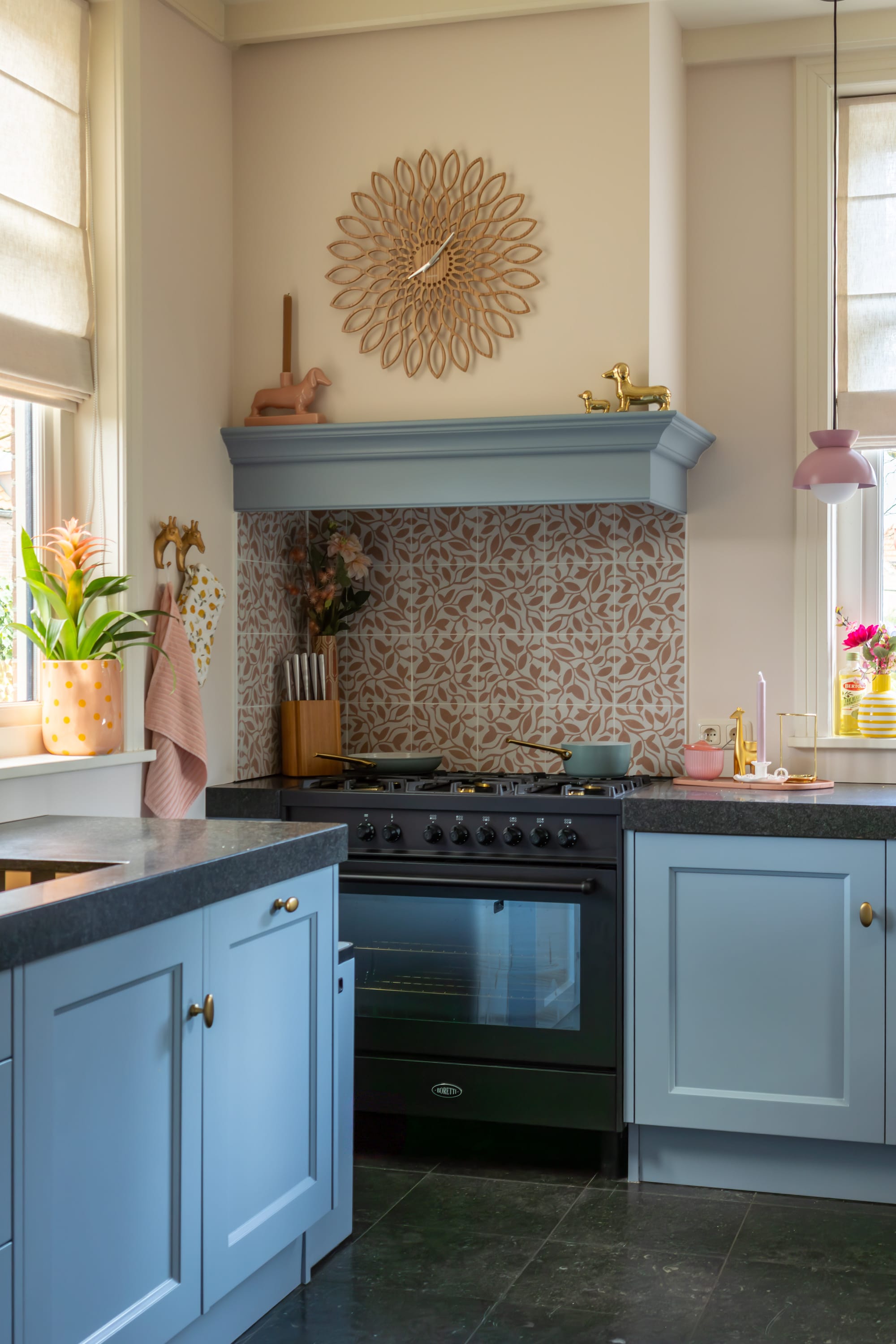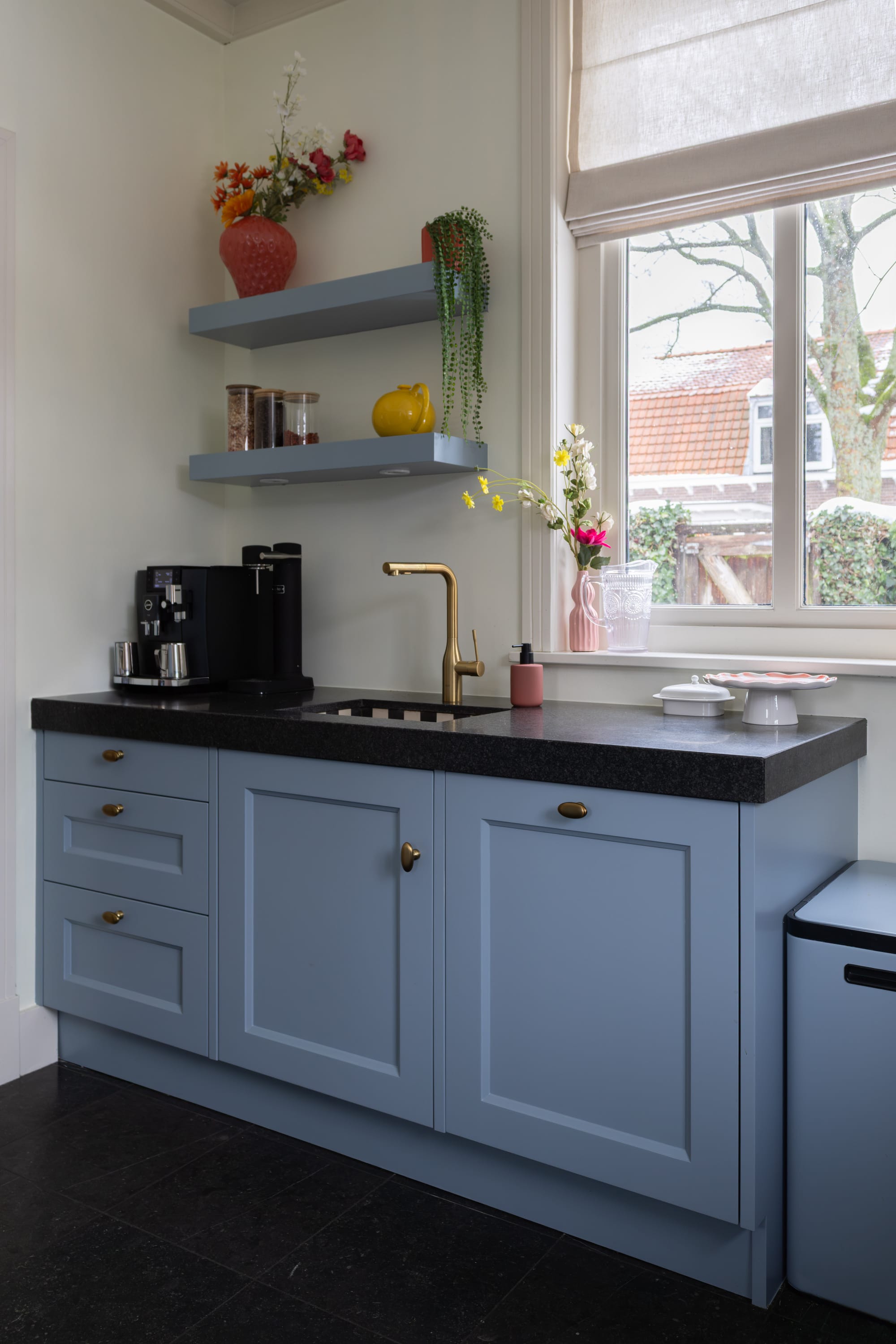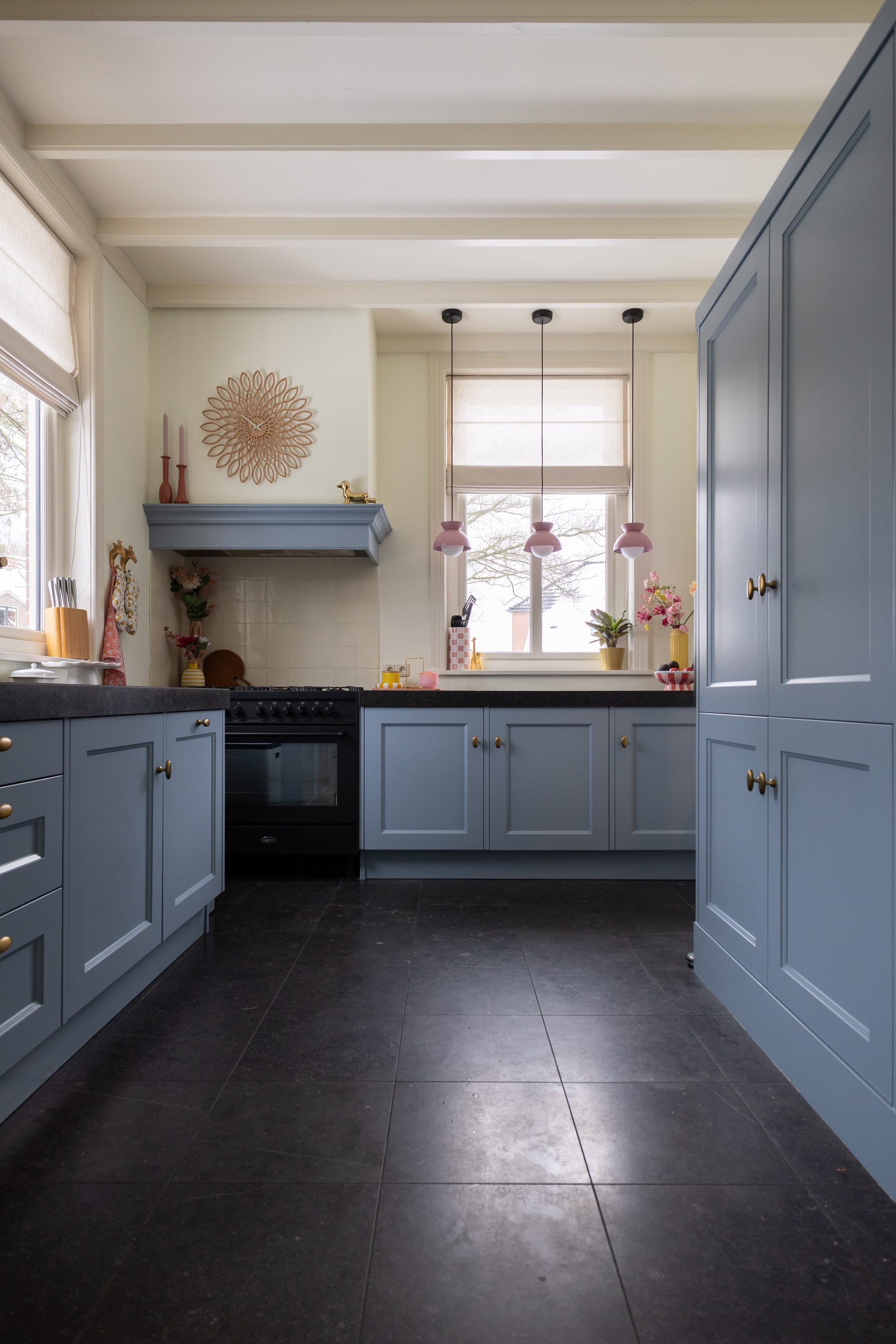Vanaf het begin dacht ik aan een blauwe keuken. In ons vorige huis konden we daar slechts korte tijd van genieten en ik vond het juist zo mooi. Hier was ik opeens bang dat het te kil zou worden in combinatie met het donkere aanrecht en de donkere vloer. Toen die twijfel toesloeg, was het hek van de dam. Ik begon aan alles te twijfelen en ik heb nog nooit zóveel kleurtesters gebruikt.